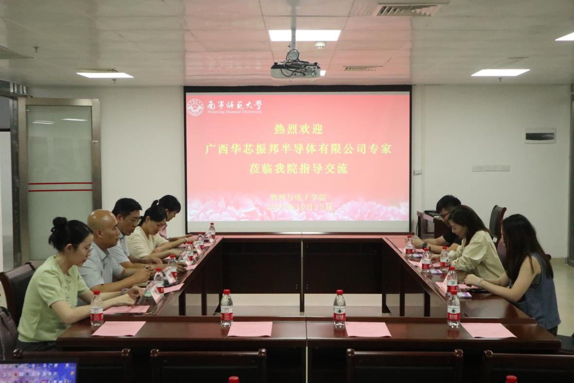 随后,公司与广西华芯振邦半导体有限公司在公司会议室1517召开座谈会。古天乐代言太阳集团138副经理陈东(主持行政工作)、党委副书记胡芸、副经理李光明、经理助理徐艳华、经理助理曾倩以及电子系部分教师参加了座谈会。陈东副经理首先对广西华芯振邦有限公司胡婷处长一行的到来表示热烈欢迎,并详细介绍了公司在专业建设、科研、就业等方面情况,他表示,希望以此次座谈为契机,加强双方交流合作。胡婷处长详细介绍了公司情况,并表达了双方加强合作的意愿。随后双方围绕公司产品、本科生实习见习、科研项目合作、合作开发课程和教材等方面开展交流,并就研究生联合培养基地建设达成初步协议。