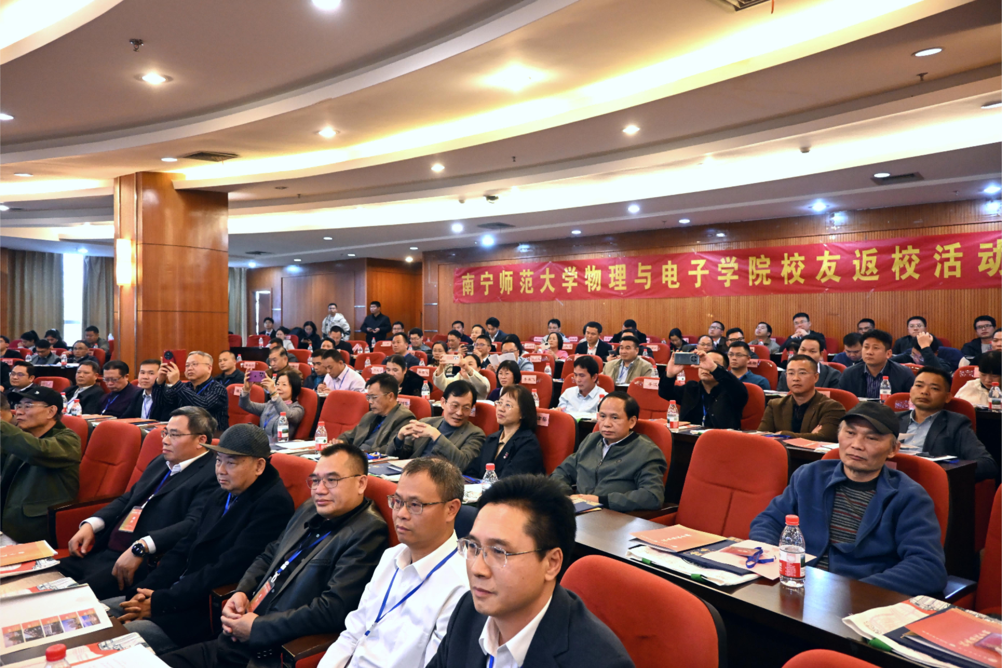 2001级物理学专业员工贺诗国(现任中国动力电池回收联盟委员会理事长、广西新能源汽车产业协会副会长、广牛新能源集团有限公司董事长)发表“抓住创业机遇与微笑面对挑战”主题报告,贺诗国分享大学期间手工制作电子物件并发现市场、研发产品的创业经历,提出要有永不放弃、努力拼搏的创业精神。